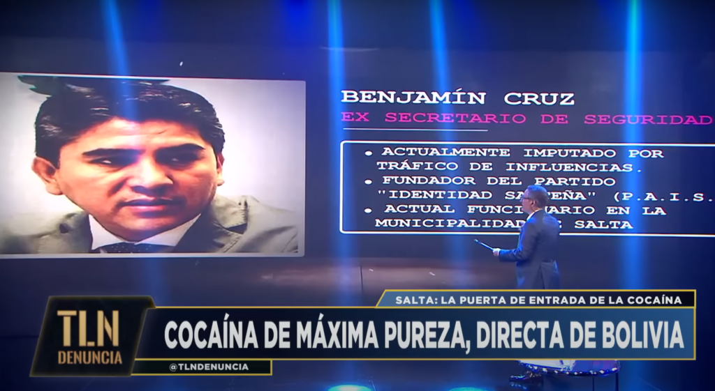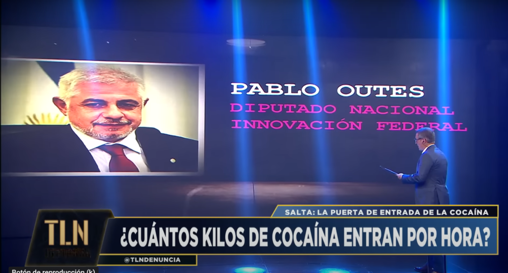 En un bloque que duró alrededor de veinte minutos analizó minuciosamente los casos de narcopolicías, el asesinato de Monges en manos del narcopoder y el vínculo con el Gobernador y dos hombres cercanos, Pablo Outes y Benjamín Cruz. Con titulares durísimos como “Escándalo Narco Político en Salta”, “Toneladas de cocaína por día en Salta”, “Cocaina de máxima pureza directo desde Bolivia”, etc., hizo un resumen del caso Monges, mostrando las imágenes ya difundidas del falso abogado con el narcotraficante Grino Palavecino.